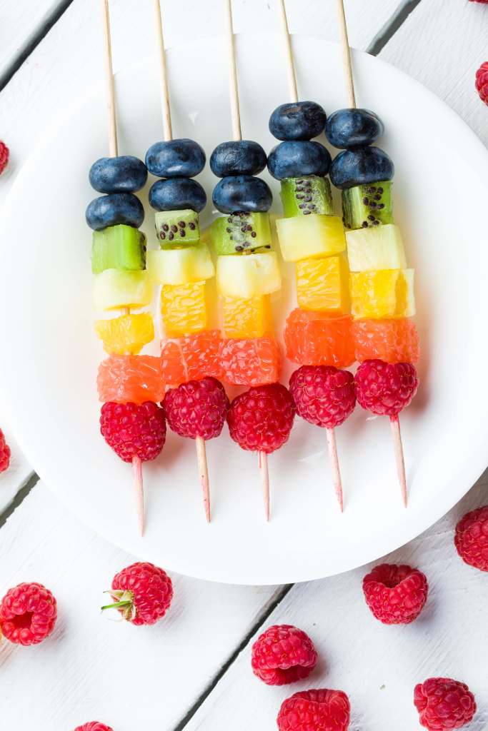 Immagine precedente Immagine successiva Mixed fruits and berries Mixed fruits and berries on skewers. studio shot